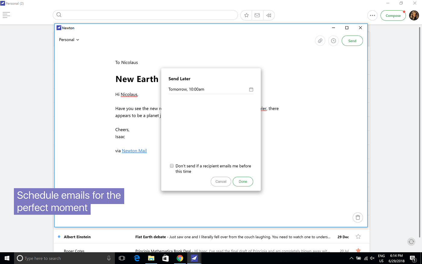Send Later can be a powerful weapon for marketers to get things done. Scheduling emails is simple within Newton and allows you to land an email exactly when you think its suitable.